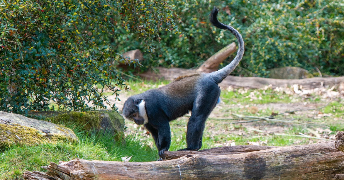 De l’Hoest meerkatten leven in Apenheul samen met de gorilla’s op het eiland. En die twee soorten kunnen prima met elkaar overweg! Vooral de jonge gorilla’s vinden het leuk om met de meerkatten te spelen.