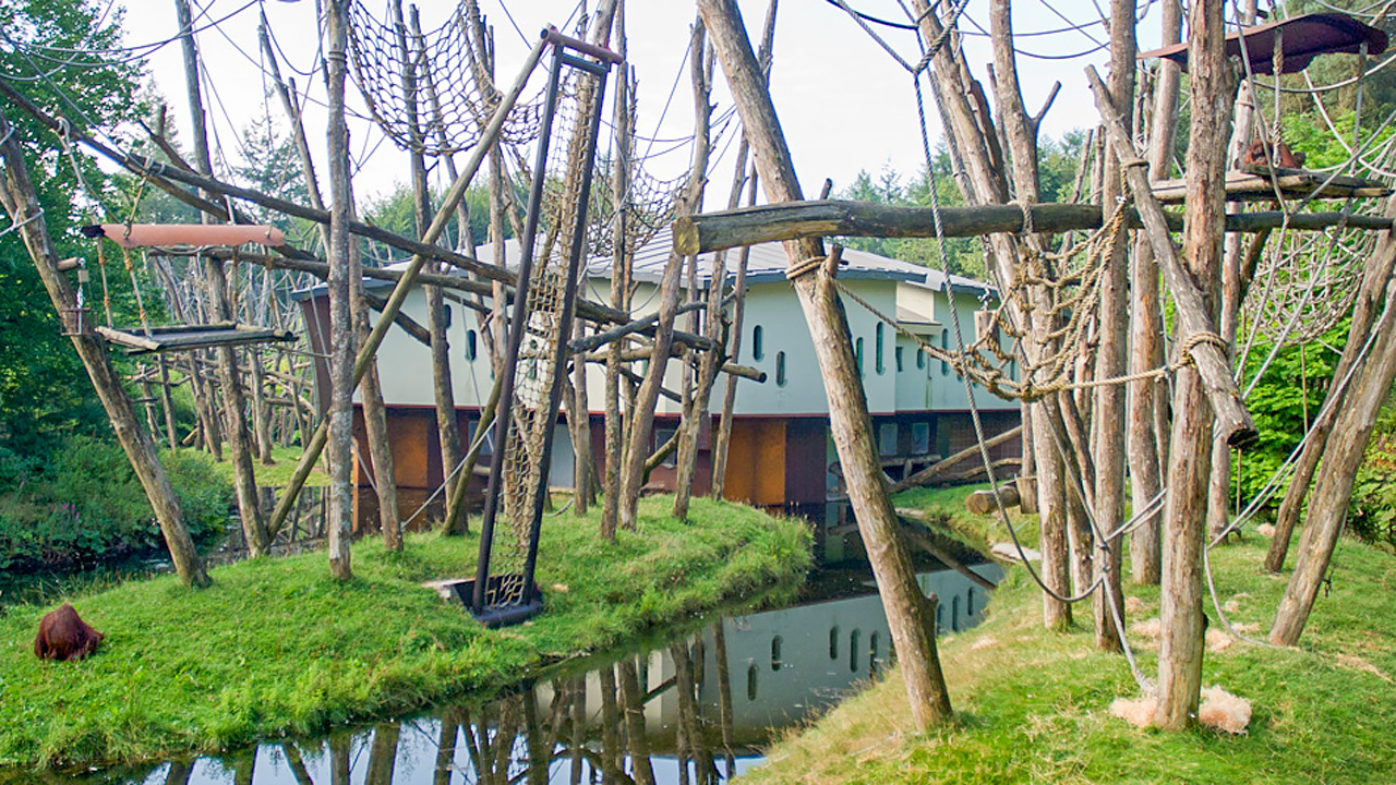 Dat is ons orang-oetanverblijf. Ondanks dat het al 24 jaar geleden is gebouwd, behoort het nog steeds tot een van de beste orang-oetangebouwen. In Europa wordt dit nog altijd als voorbeeld gezien. Het bijzondere voor die tijd is dat wij bij de bouw de leefwijze van orang-oetans in het wild als uitgangspunt hebben genomen. Ze leven namelijk semi-solitair en niet in vast gezelschap.